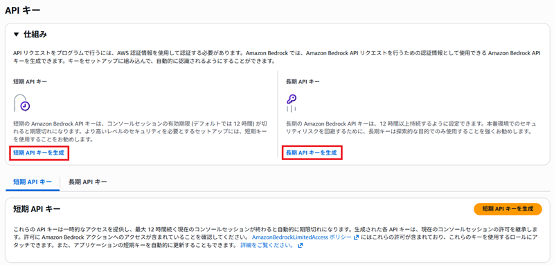Amazon BedrockのエンドポイントをPythonやNode JSなどOpenAI SDKで叩く場合に必要です。事前にAmazon Bedrock API keyを取得して認証します。APIキーは2種類あり、状況に応じて使い分けが必要です。