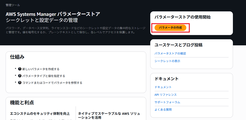 「パラメータの作成」をクリックして、上記2つの環境変数を作成してください。