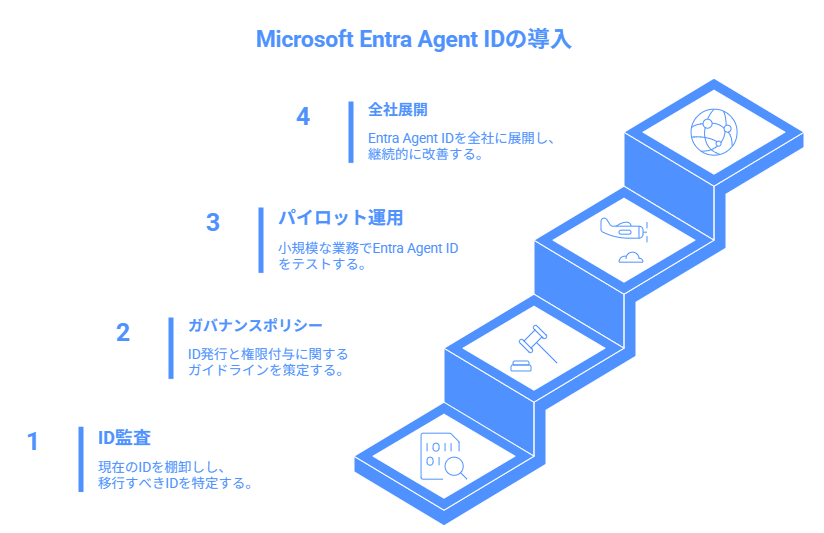 Microsoft Entra Agent IDを効果的に導入するための推奨ステップです。