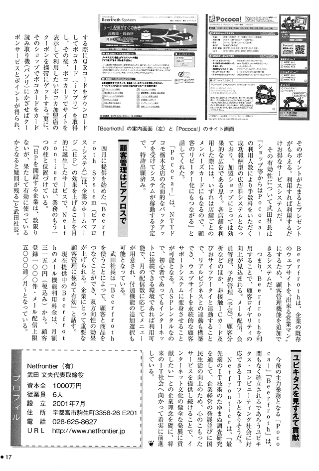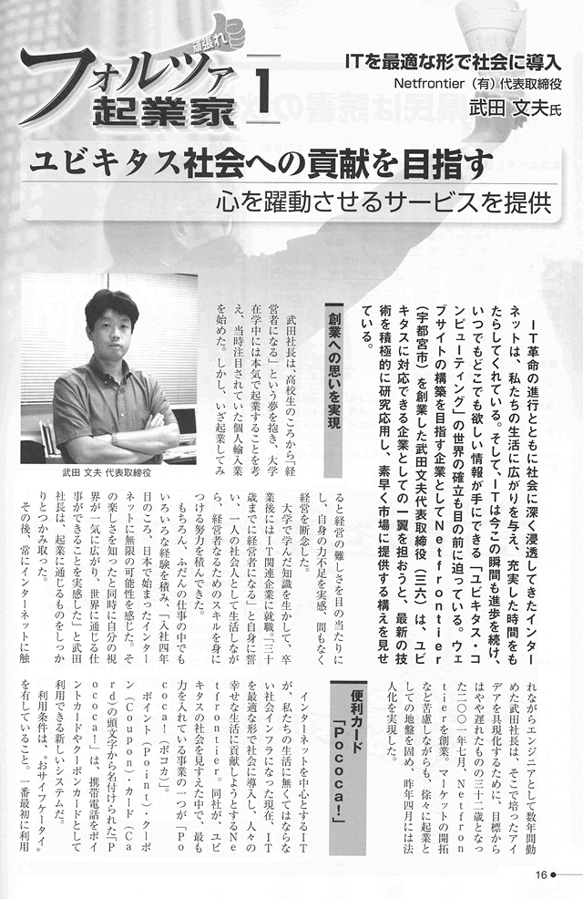 公開日:2005年10月1日 ビット栃木エリア版にNetfrontierの記事が掲載されました ビット栃木エリア版2005年10月号「フォルツァ企業家」のページにNetfrontierの記事が掲載されました。 >1ページ目 >2ページ目 ← 前の記事へ 次の記事へ →