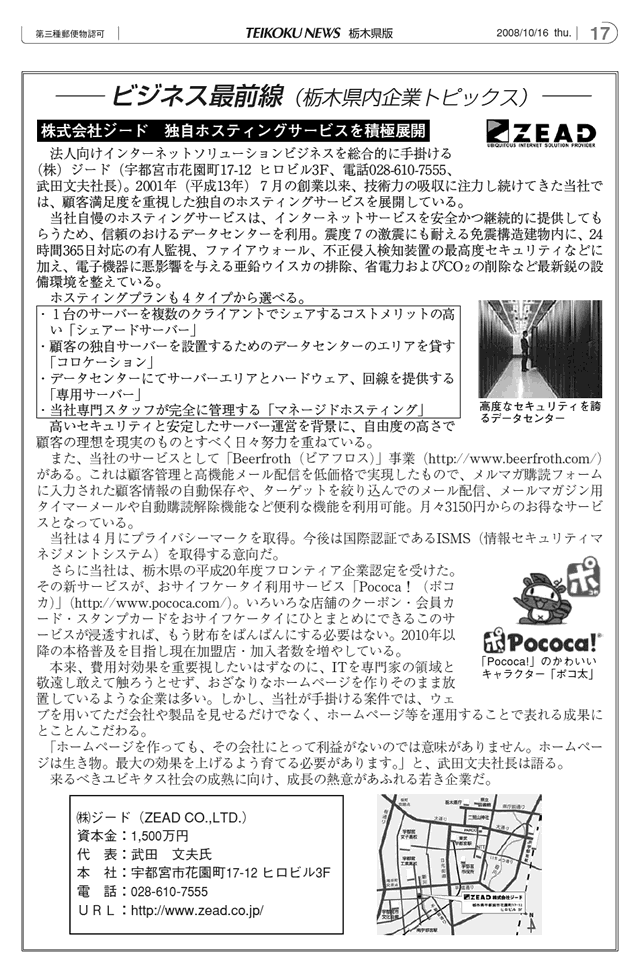 平成20年10月16日の帝国ニュース栃木版に株式会社ZEADの記事が掲載されました。 >本文はこちら