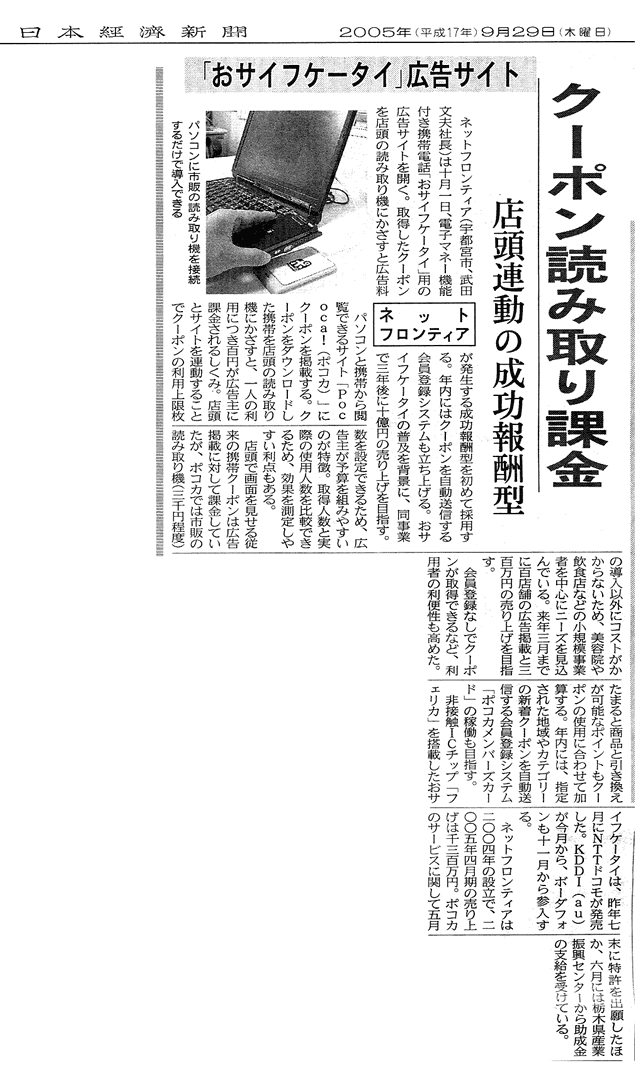 平成17年9月29日の日本経済新聞に「ポコカ」の記事が掲載されました。 >本文はこちら